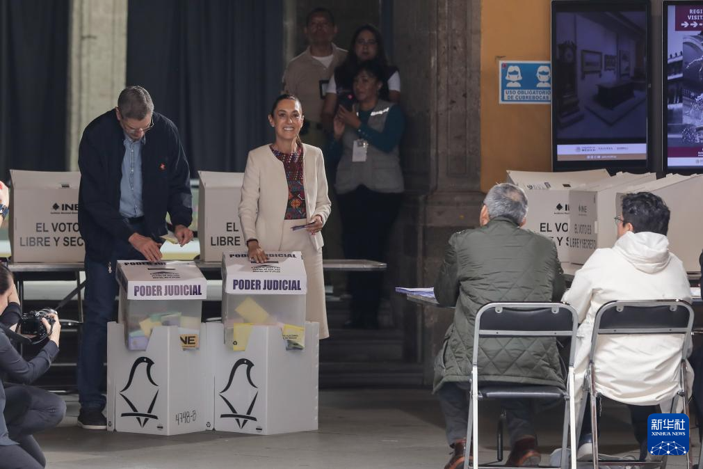 6月1日,在墨西哥首都墨西哥城,总统辛鲍姆(右)参加司法机构选举投票。