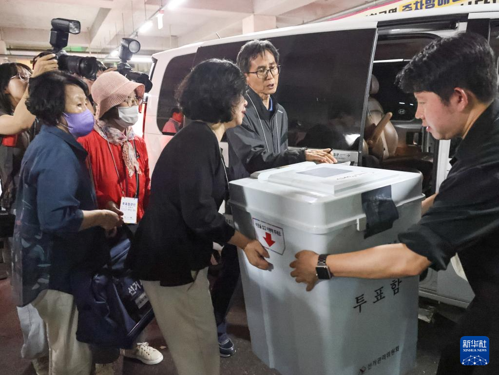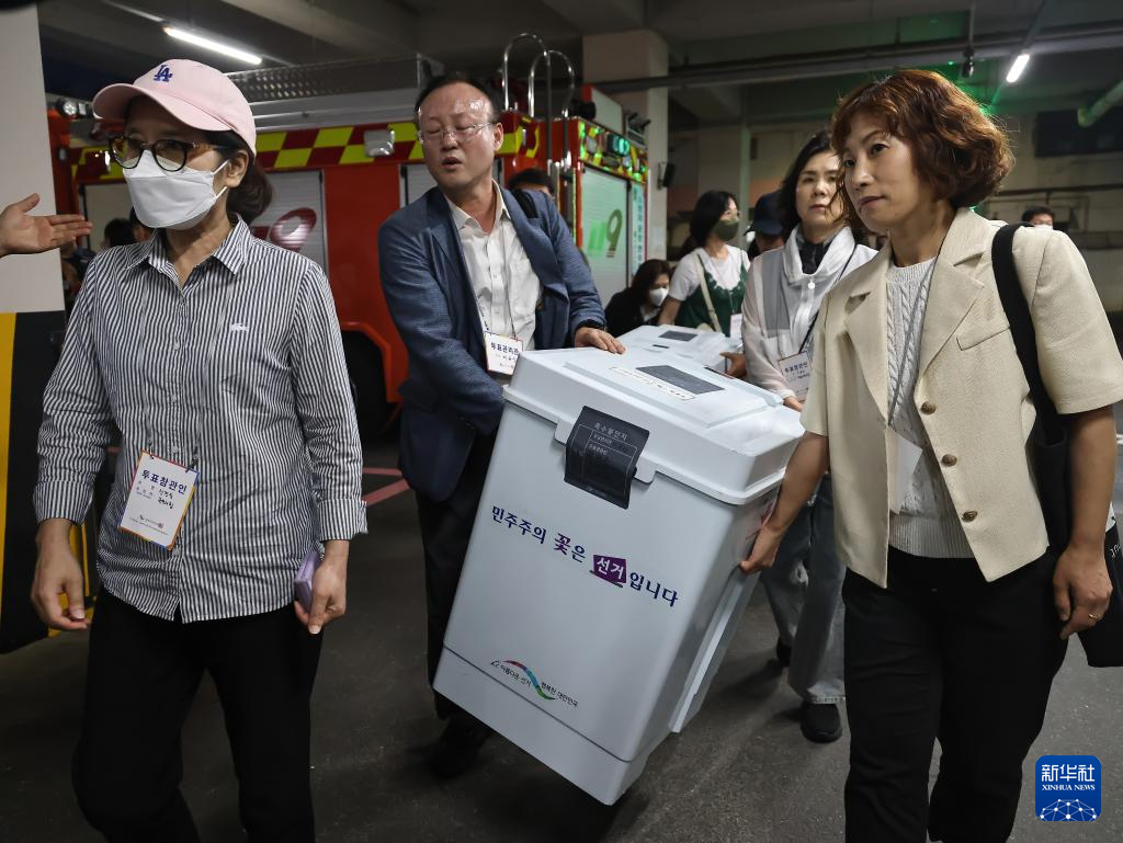 6月3日晚,工作人员在韩国首尔一处计票站运送选票。