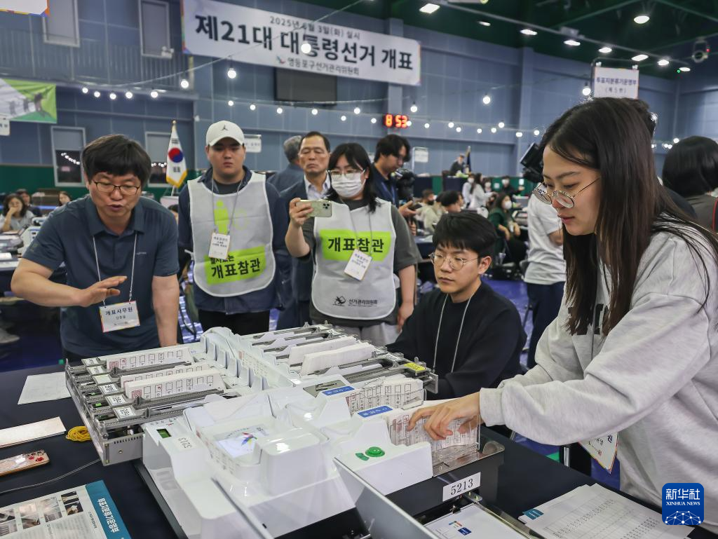 6月3日晚,工作人员在韩国首尔一处计票站计票。