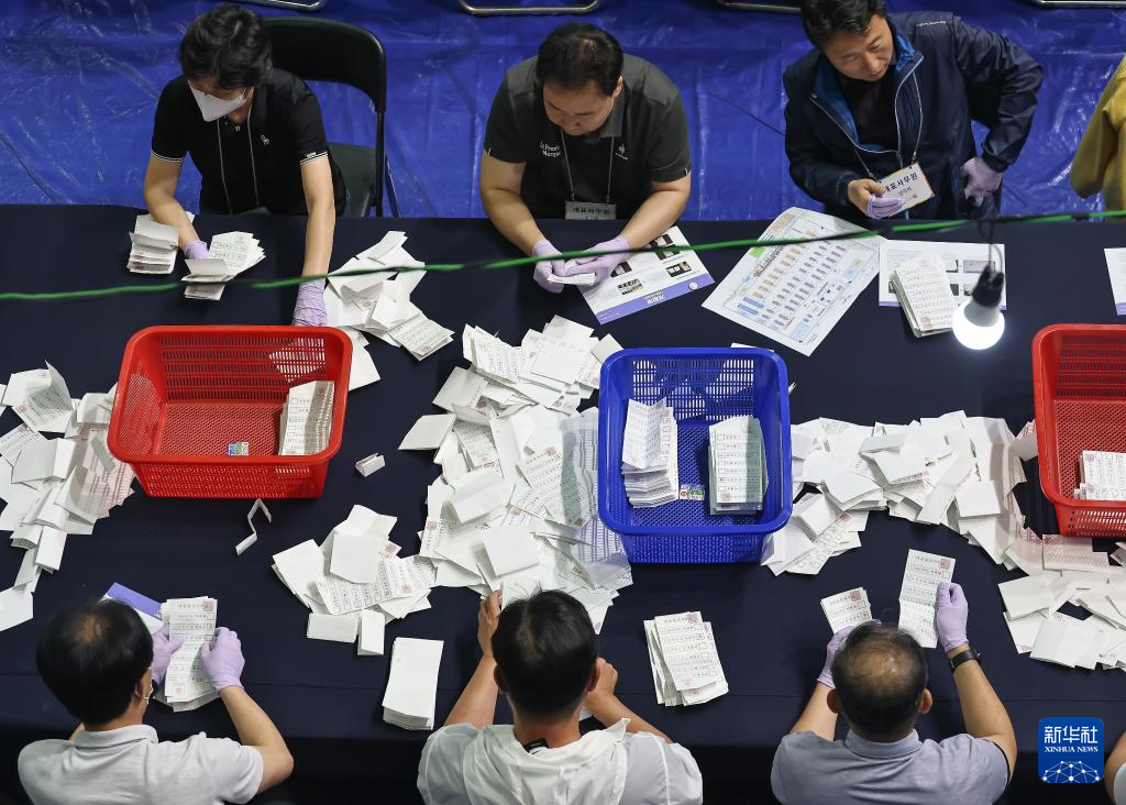 6月3日晚,工作人员在韩国首尔一处计票站工作。