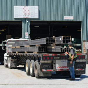 6月3日,在加拿大不列颠哥伦比亚省德尔塔一处钢材厂,工人固定卡车上的钢材产品。