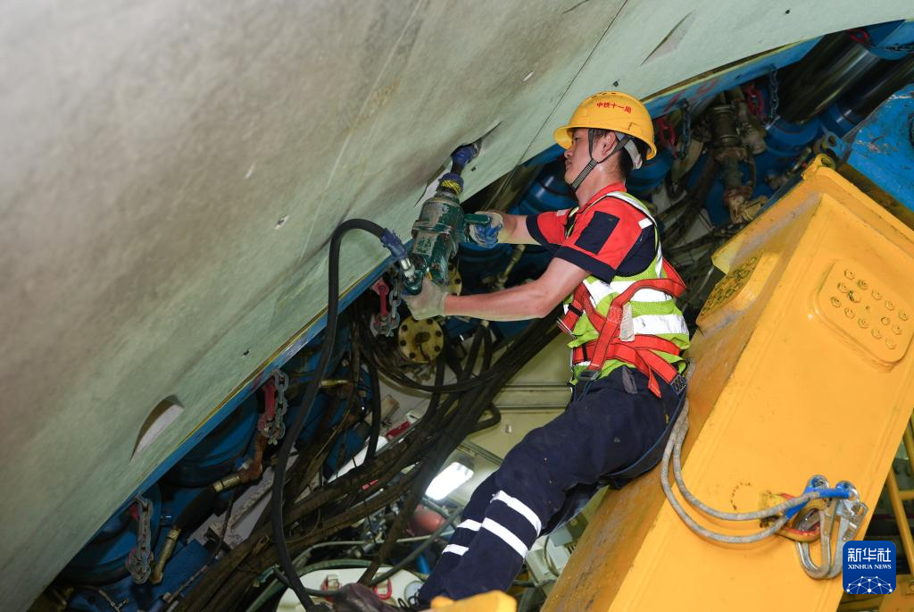 6月5日,中铁十一局技术人员在甬舟铁路金塘海底隧道“定海号”盾构机内关注设备运行情况。