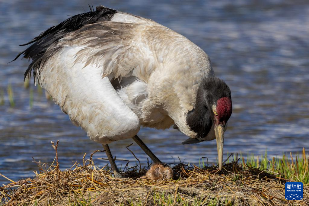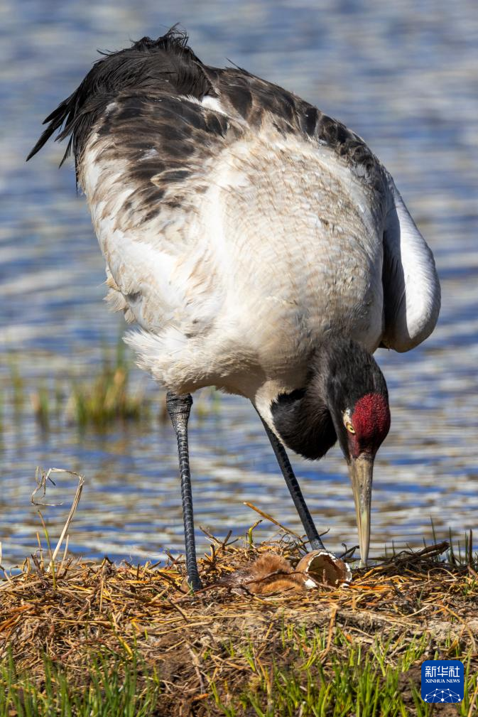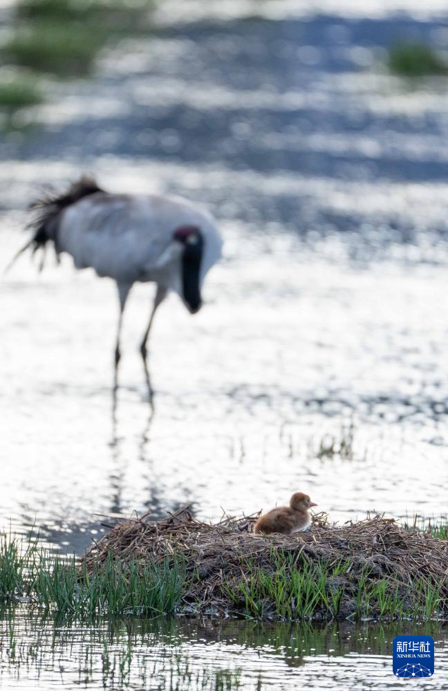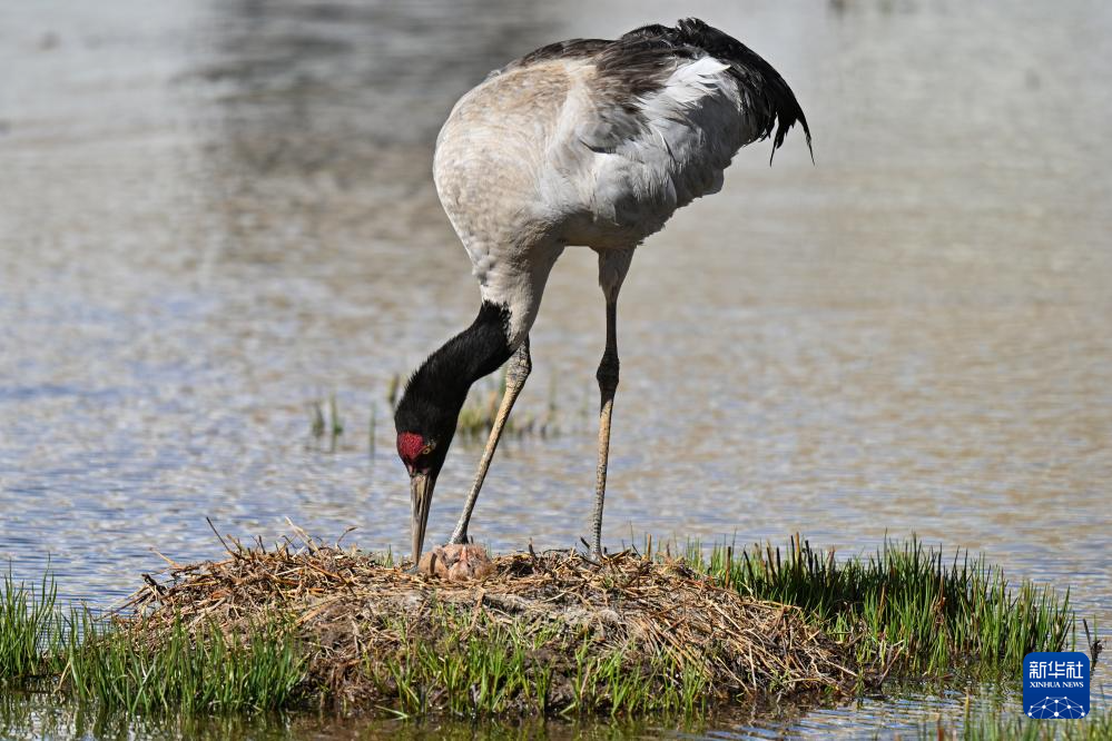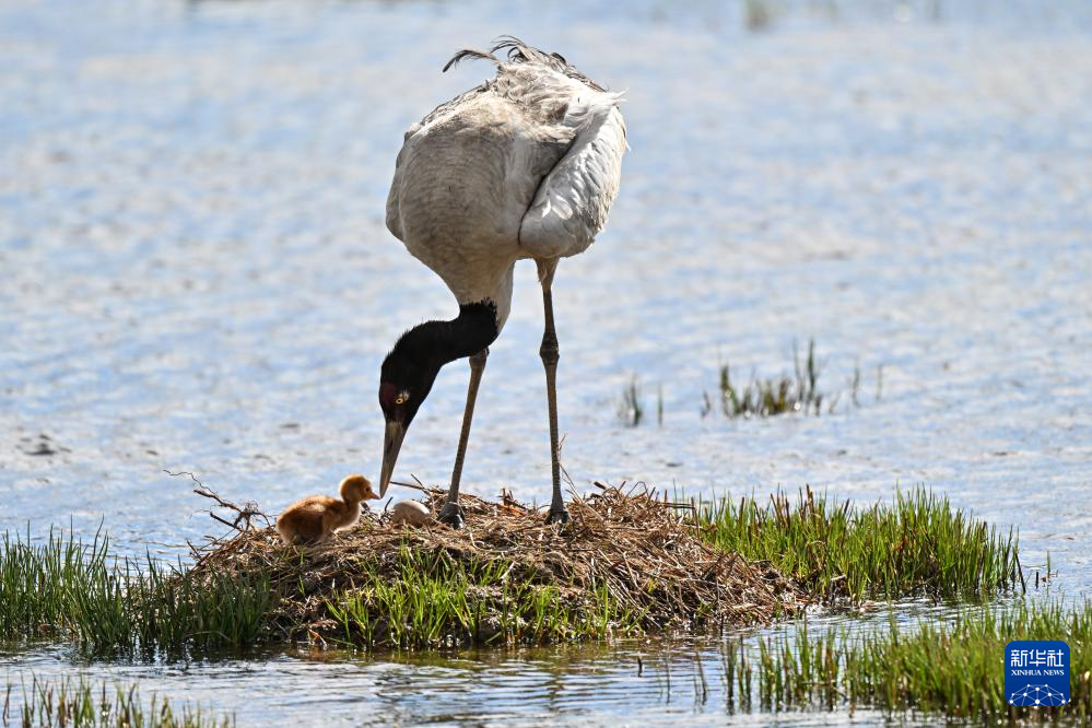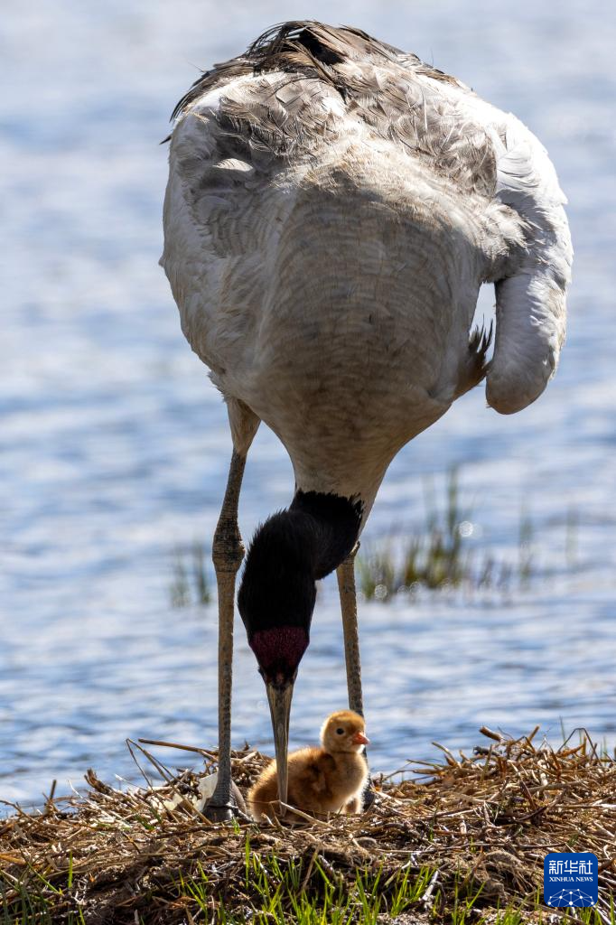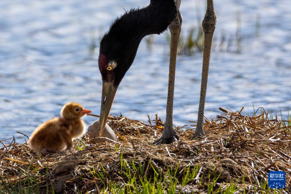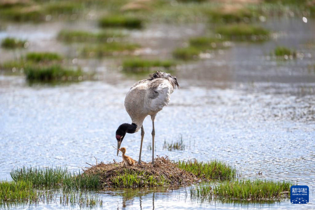 6月4日,在西藏那曲市申扎县,一只黑颈鹤查看刚出生雏鸟的情况。