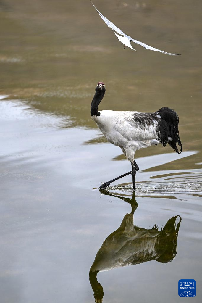 6月4日,在西藏那曲市申扎县,一只黑颈鹤试图驱赶鸟巢附近活动的渔鸥。
