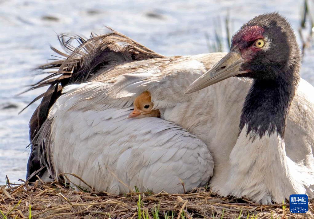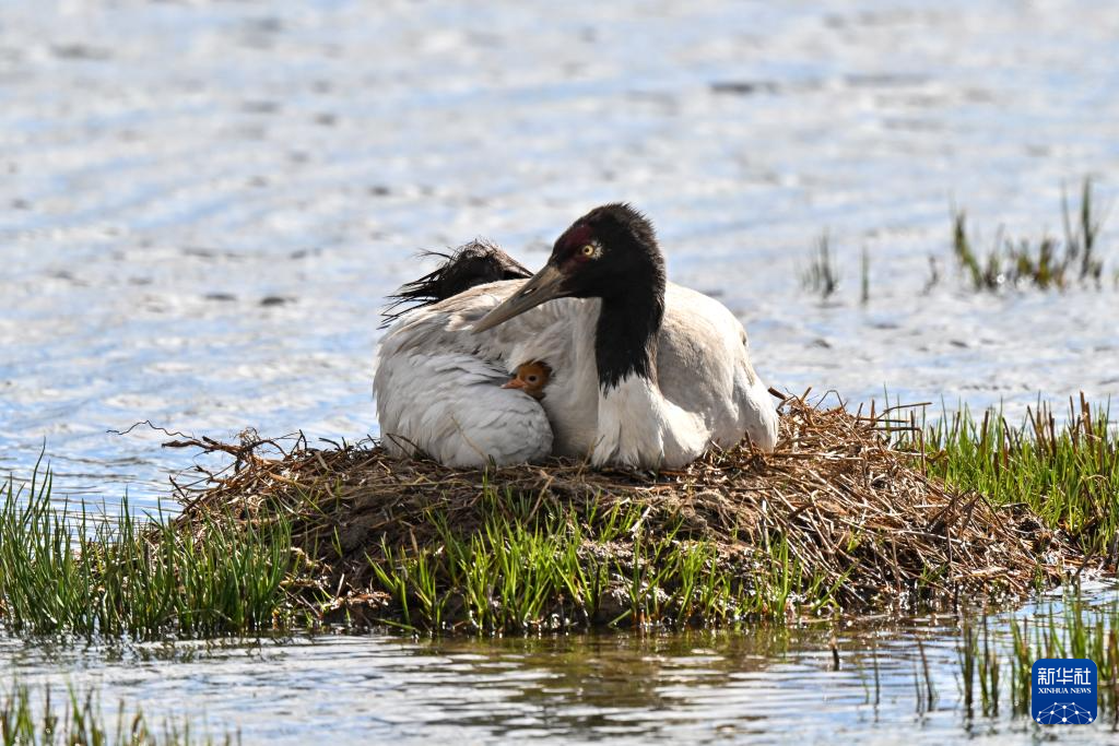 一对黑颈鹤在那曲市申扎县的湿地上照顾刚出壳的雏鸟,一只将其护在身下保持温暖,另一只则在旁保持警戒(6月4日摄)。