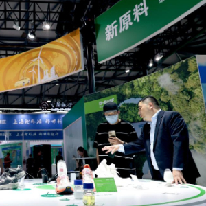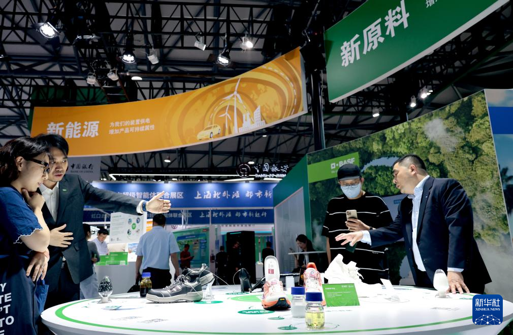 6月5日,工作人员在一组新材料应用产品展示台前向参观者做介绍。
