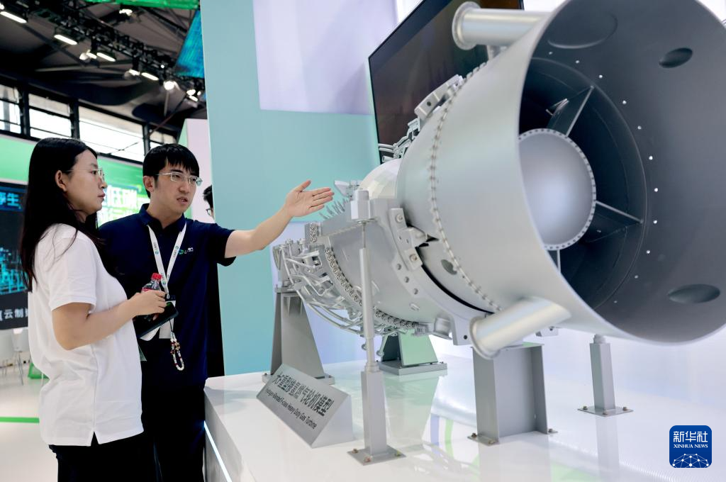 6月5日,工作人员(右)在一个重型掺氢燃气轮机模型旁向参观者做介绍。