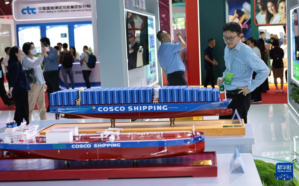 6月5日,参观者在一个甲醇双燃料动力集装箱船模型前驻足观看。