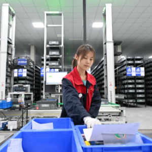 6月5日,河北省任丘市一家电力装备制造企业的工人在智能仓库内核对产品信息。