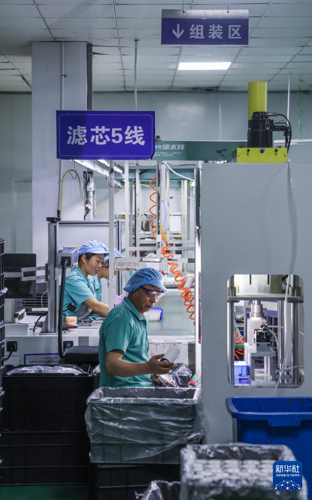 6月5日,在位于浙江慈溪的宁波鼎安电器有限公司,工人在滤芯生产流水线上工作。该企业专业生产包含净化、加热、制冷、制冰等核心功能的净饮水器产品,已形成年产60万台整机设备及400万支滤芯的智造能力,也是国家高新技术企业。