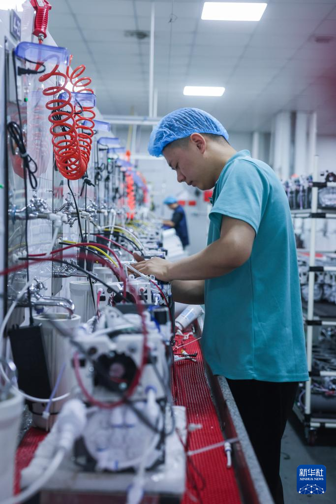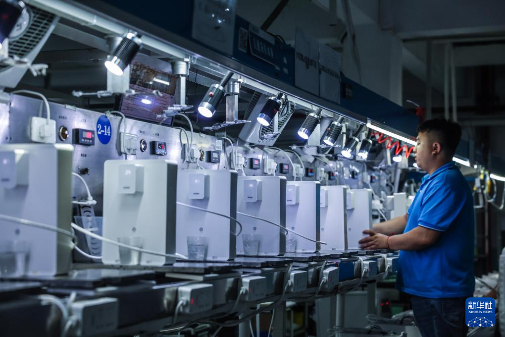 6月5日,在位于浙江慈溪的宁波鼎安电器有限公司车间内,工人在流水线上装配饮水机。该企业专业生产包含净化、加热、制冷、制冰等核心功能的净饮水器产品,已形成年产60万台整机设备及400万支滤芯的智造能力,也是国家高新技术企业。
