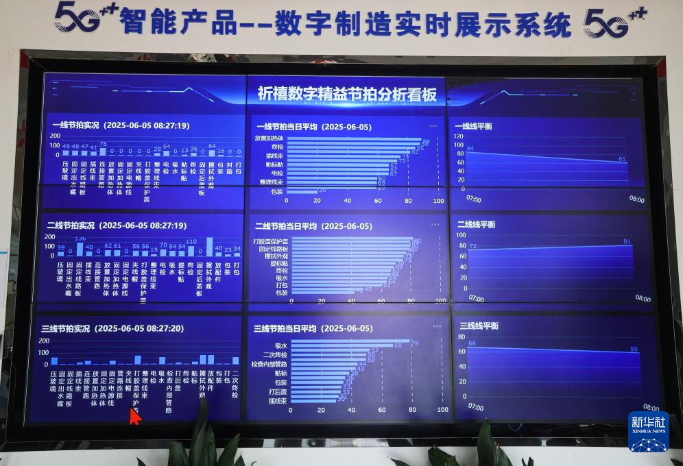 6月5日在浙江慈溪宁波祈禧电器有限公司拍摄的5G数字车间数字大屏,实时显示各条生产线的生产情况。该企业是一家集研发、制造、销售为一体的净饮水设备及核心配套产品专业厂家,也是国家高新技术企业和浙江省知识产权示范企业。