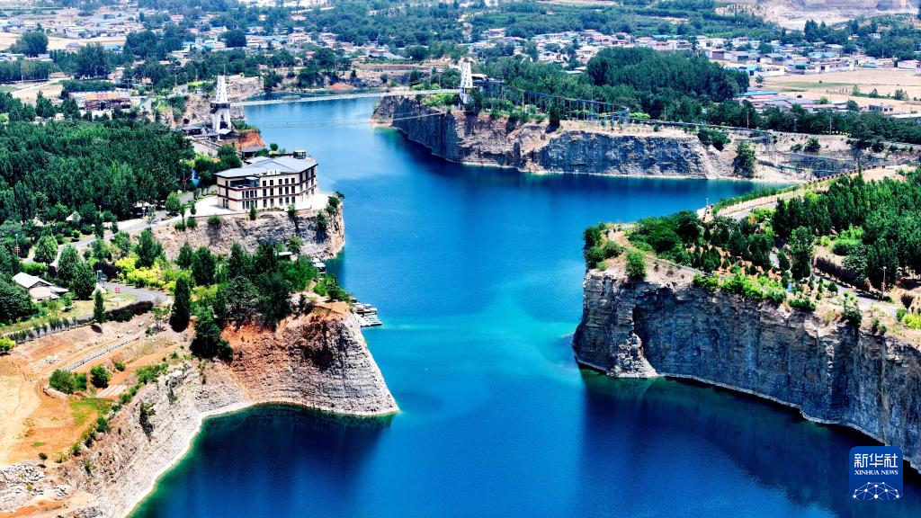 这是6月4日拍摄的菏泽市巨野县核桃园镇白虎山天池风景区。该景区是当地对关停矿山、废弃矿坑进行综合治理和生态修复后打造而成的(无人机照片)。