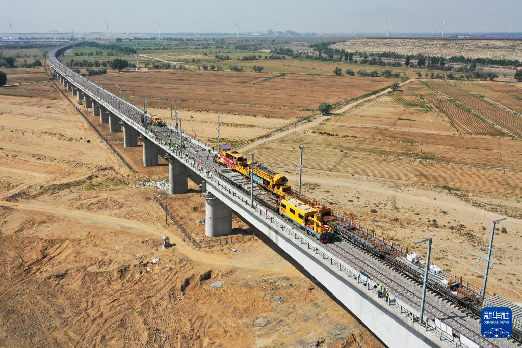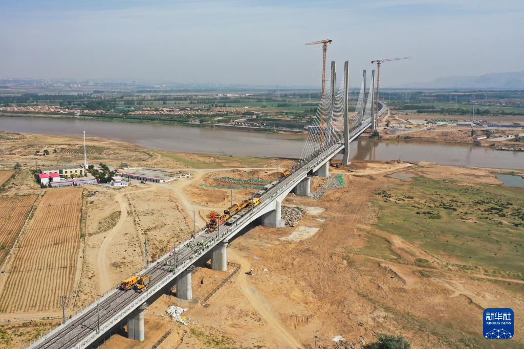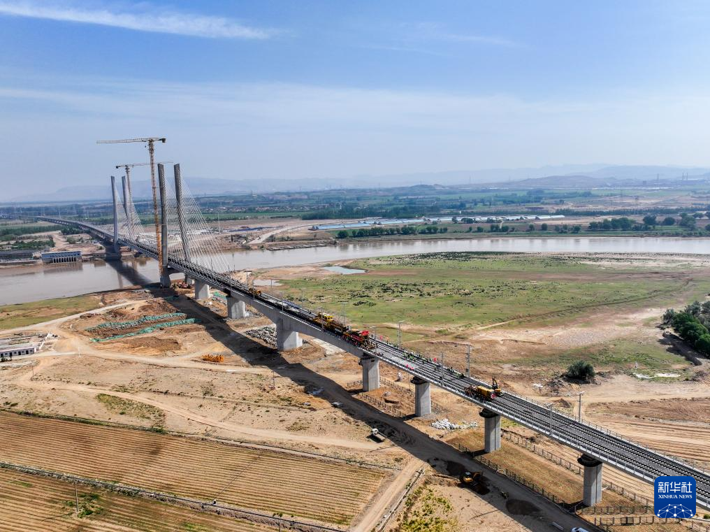 这是6月6日拍摄的包银高铁乌海黄河特大桥铺轨施工现场(无人机照片)。