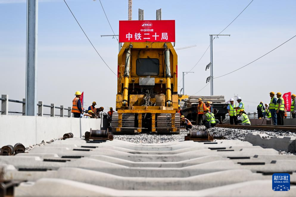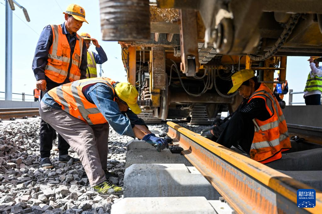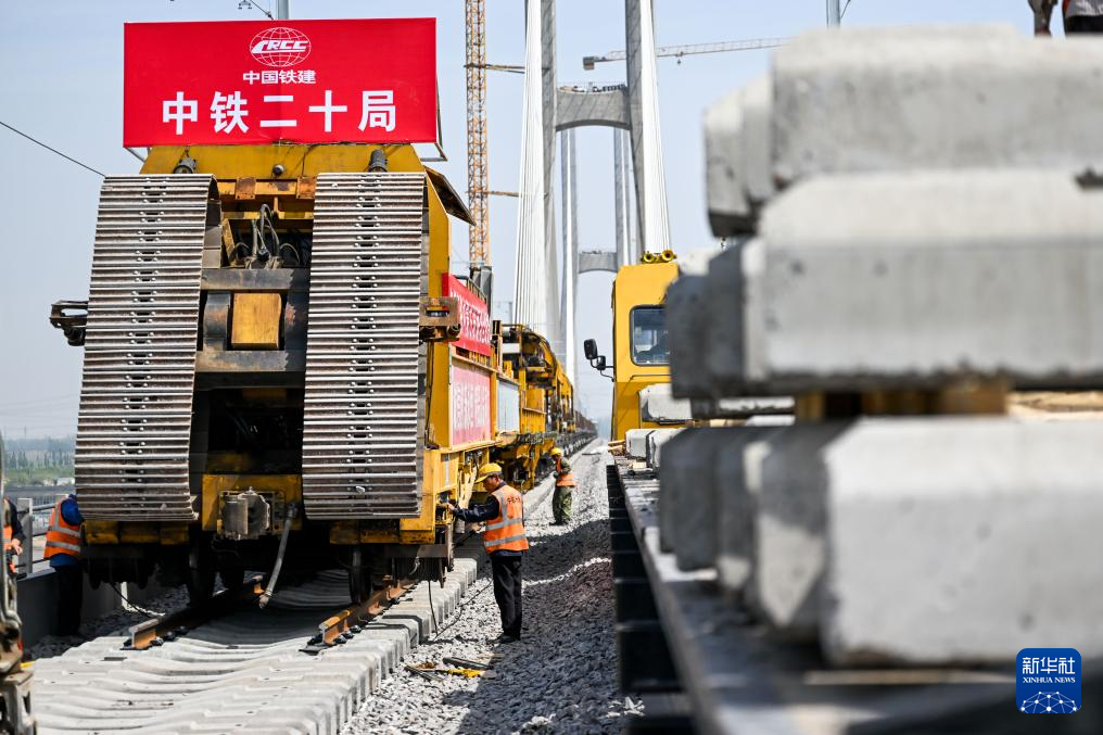 6月6日,在包银高铁乌海黄河特大桥,工人操作工程机械进行铺轨作业。