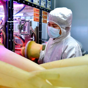 6月6日,在位于嘉祥县的山东盈和电子科技有限公司,工作人员在石英晶体谐振器生产设备前值守。