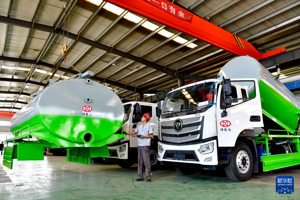 6月6日,在位于嘉祥县的山东祥农专用车辆有限公司,工作人员在吊运环卫车厢体。