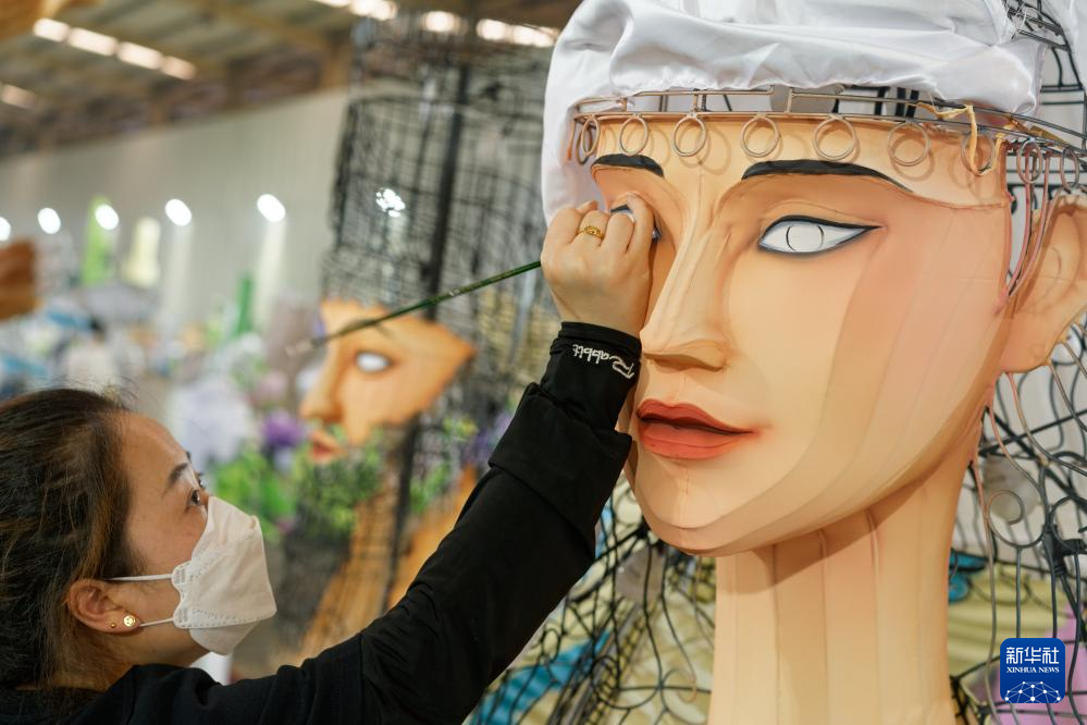 2025年6月4日,工作人员在四川省自贡市灯彩集团厂房内为彩灯手绘眼睛。