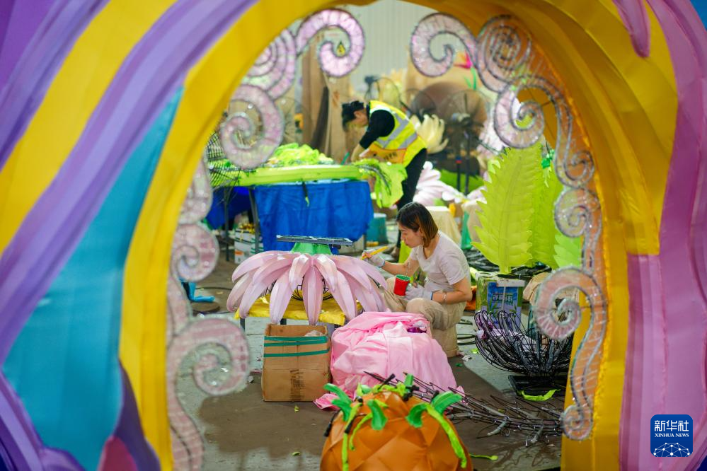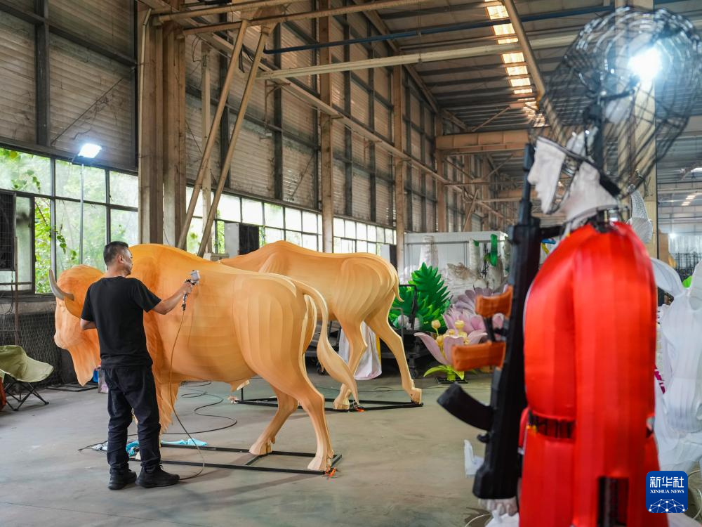2025年6月4日,工人在四川省自贡市灯彩集团厂房内为彩灯喷绘上色。