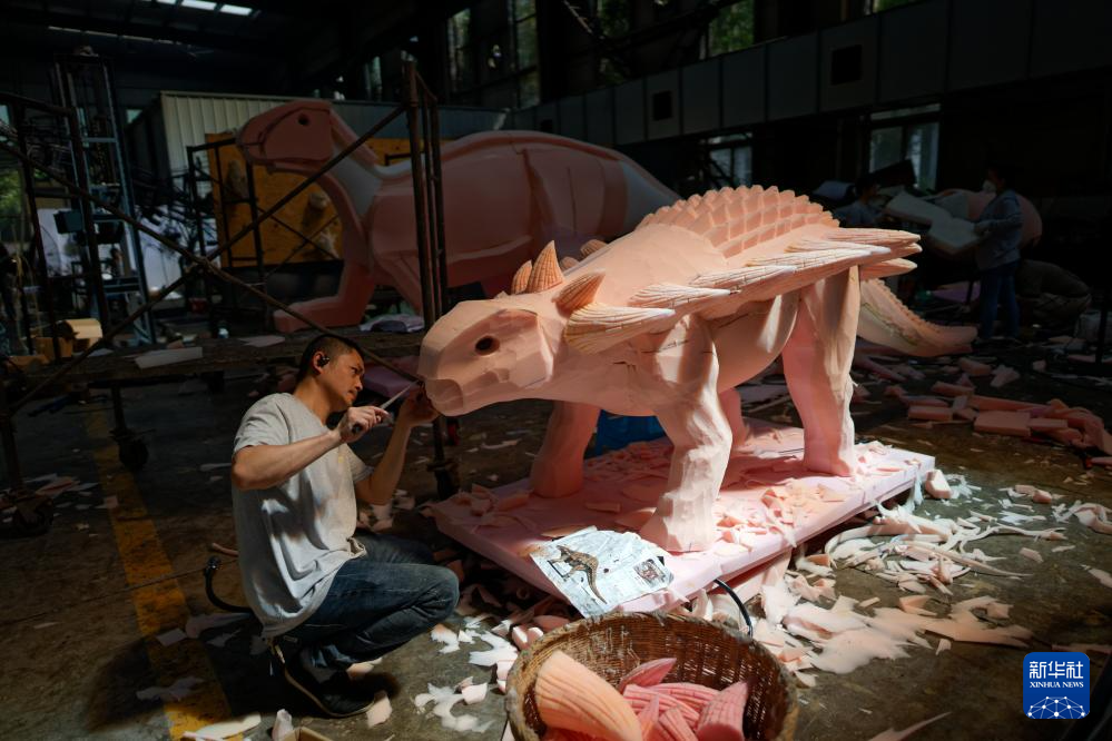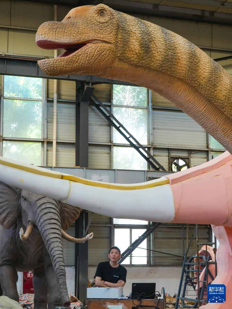 2025年6月4日,工作人员在四川省自贡市自贡亘古龙腾科技有限公司的厂房内为仿真恐龙进行精细造型工作。