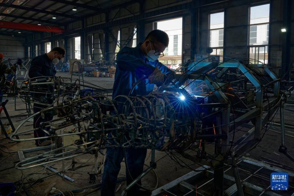 2025年6月4日,工作人员在四川省自贡市自贡亘古龙腾科技有限公司的厂房内焊接仿真恐龙的骨架和电机。