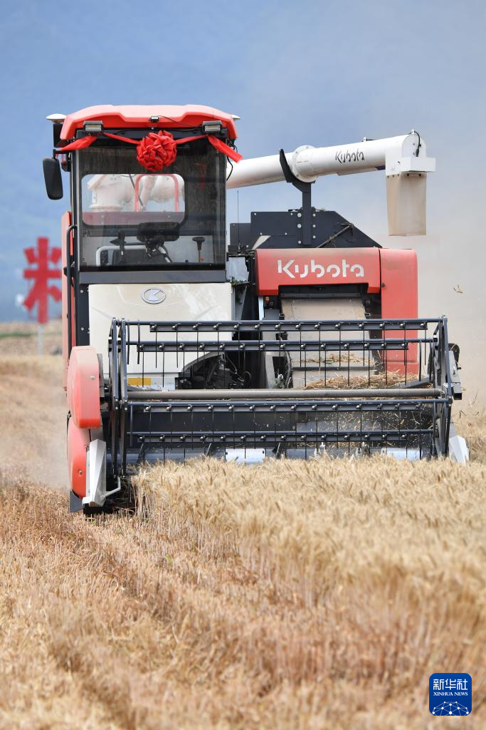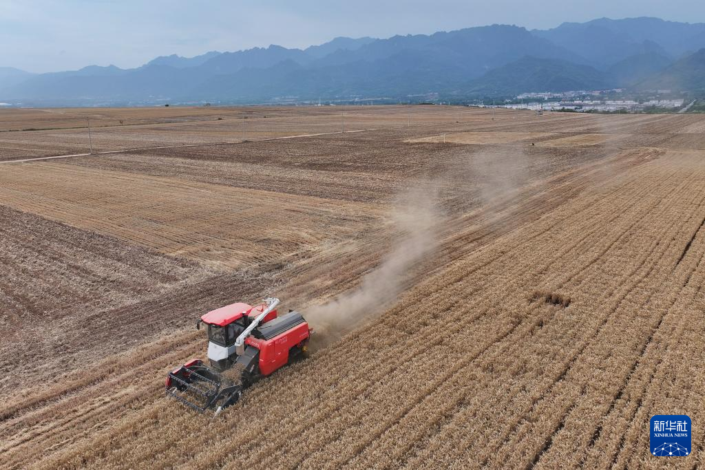6月6日,收割机在神禾塬万亩优质粮食生产基地作业。