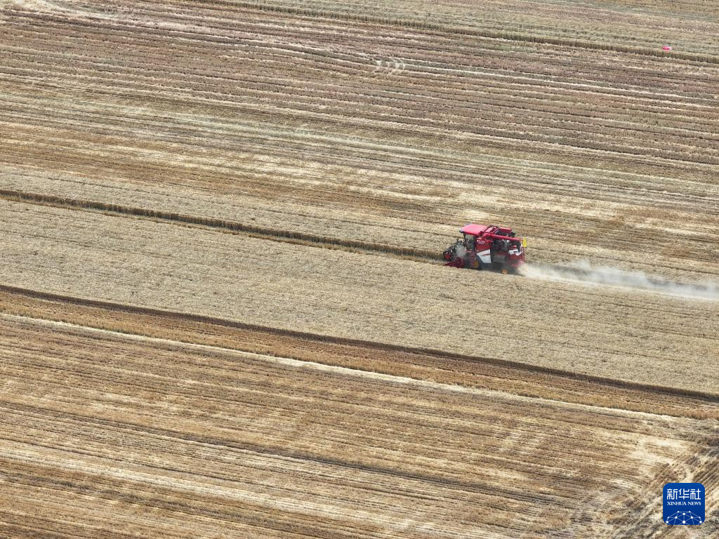 6月6日,收割机在神禾塬万亩优质粮食生产基地作业(无人机照片)。