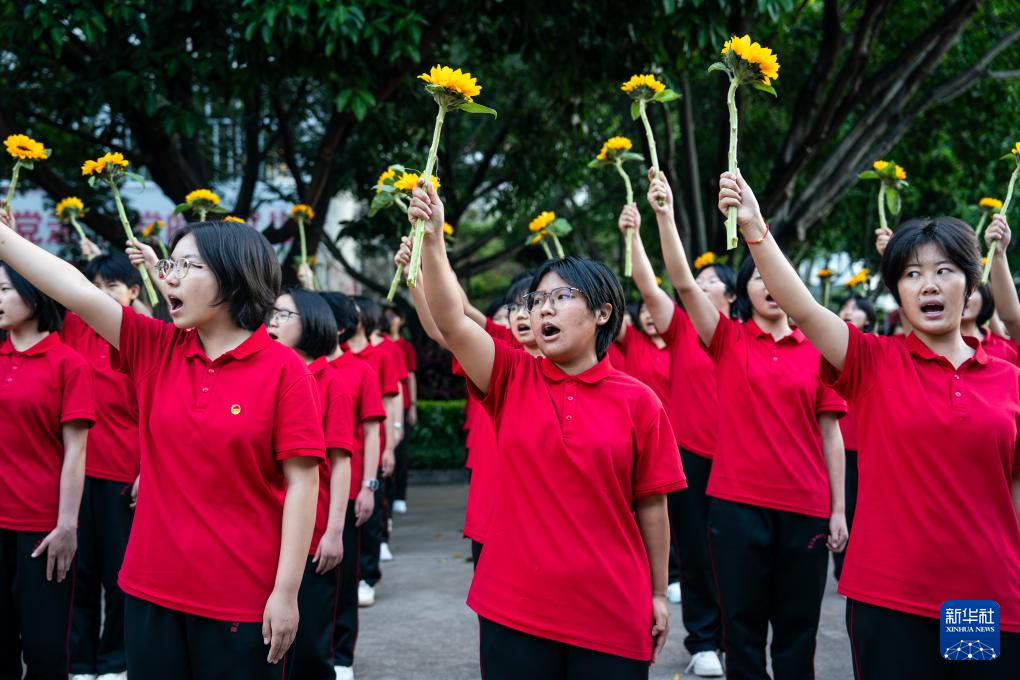 6月7日,低年级学生手举向日葵,祝愿高三学生考试顺利。