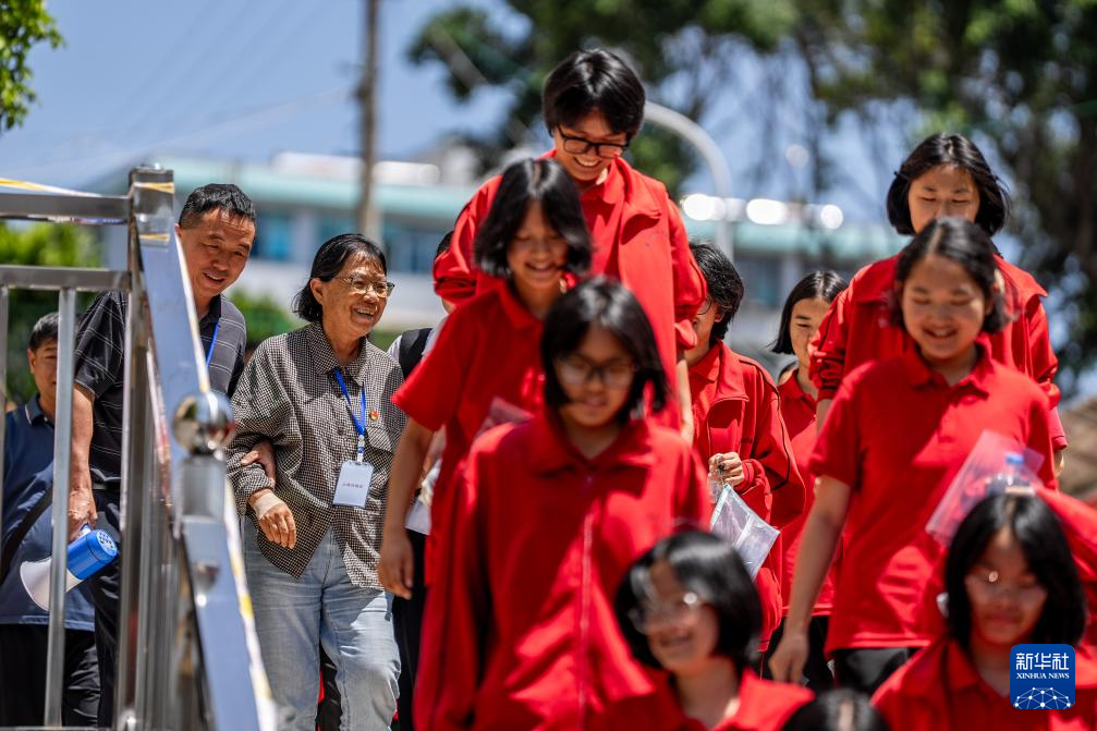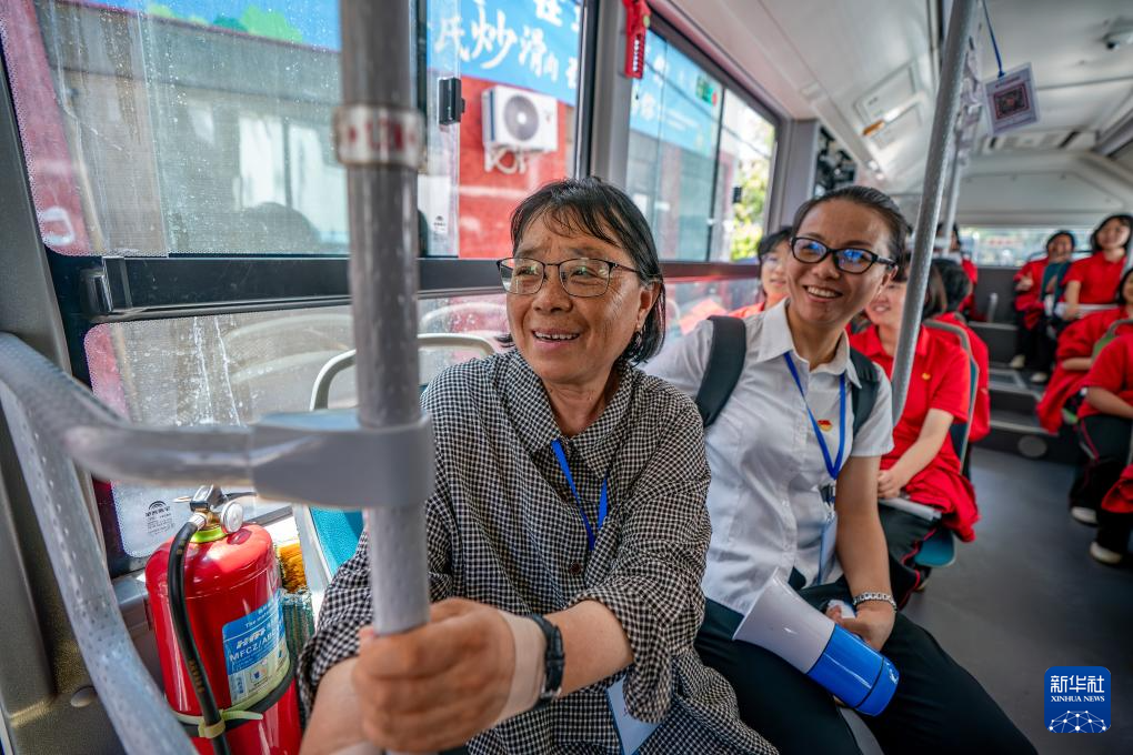 6月7日,张桂梅与学生在返校的车辆上一起唱歌。