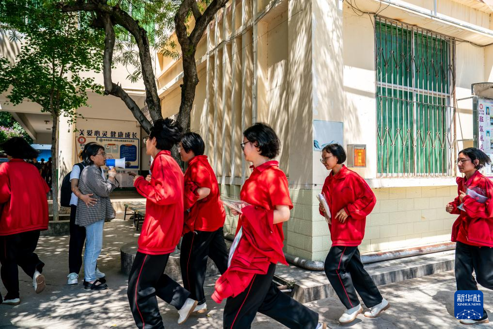 6月7日,张桂梅在考场外组织走出考场的学生集合。