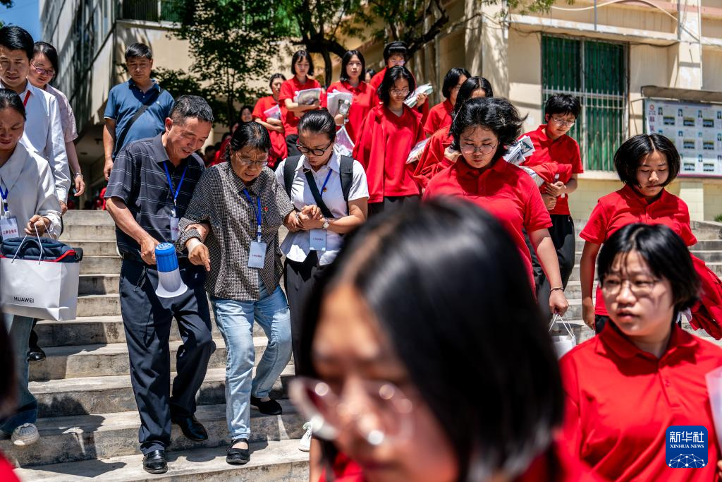 6月7日,张桂梅在同事的搀扶下与考生一起离开考点。