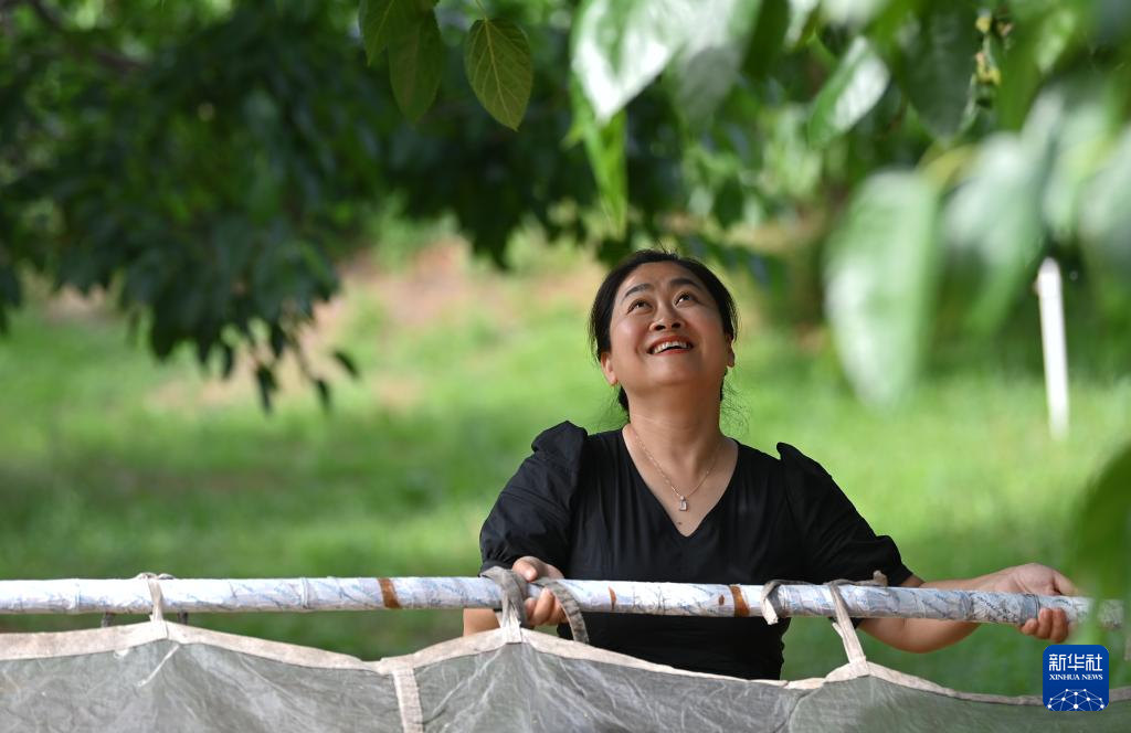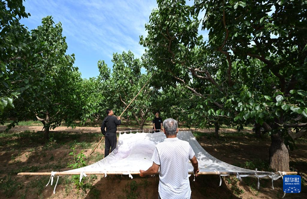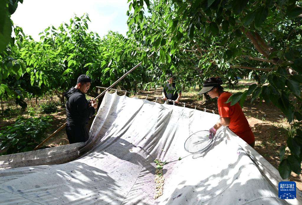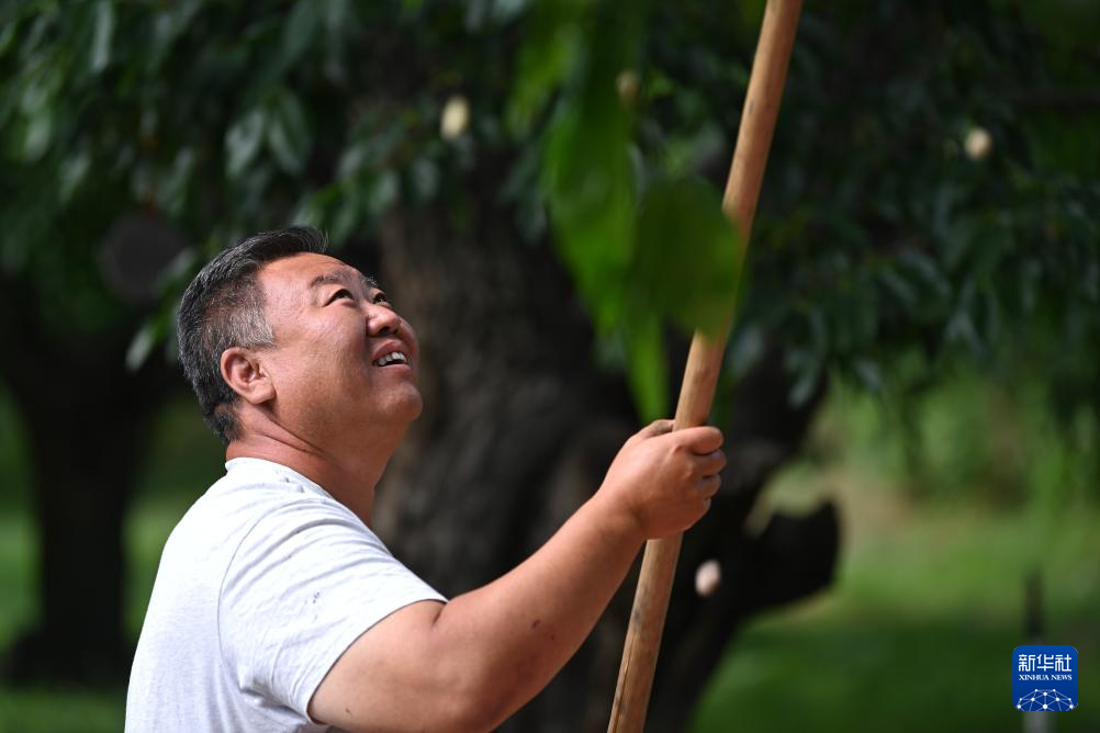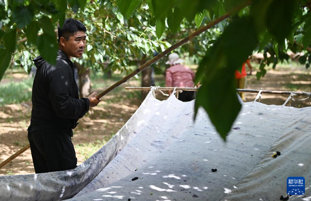 天津市蓟州区别山镇的农户手拿打棍收获白桑葚(6月6日摄)。