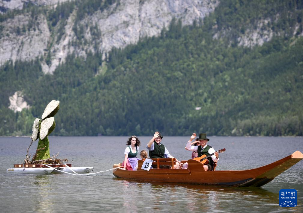 这是6月1日在奥地利中部小城阿尔陶塞拍摄的水仙花节水上花船巡游。
