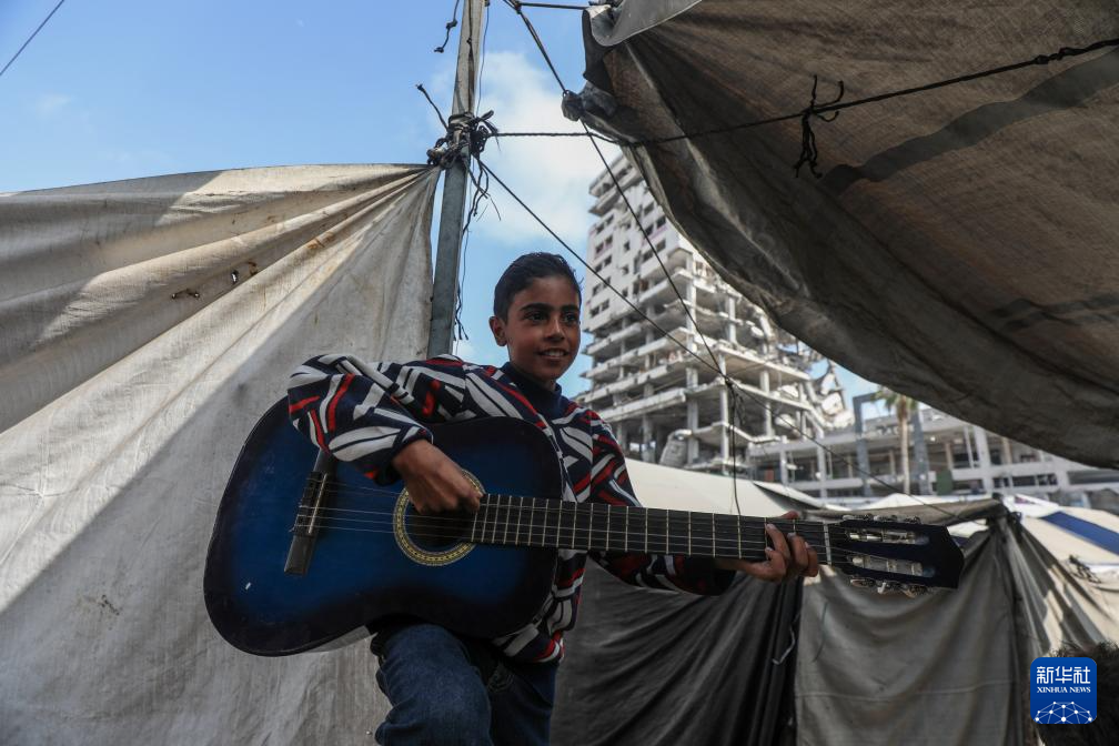 6月3日,一名巴勒斯坦儿童在加沙城一个流离失所者的临时营地里学习弹吉他。