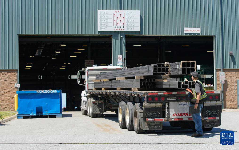 6月3日,在加拿大不列颠哥伦比亚省德尔塔一处钢材厂,卡车运送钢材产品。