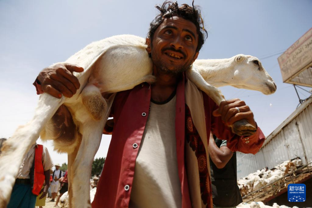 6月2日,在也门首都萨那,一名男子在集市上扛着购买的羊。