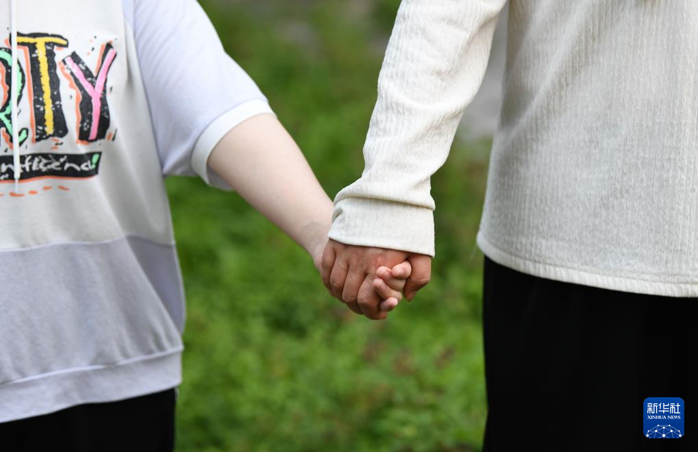 5月25日,在宿城一中宿马学校,妈妈许成香拉着王子文(左)的手散步。