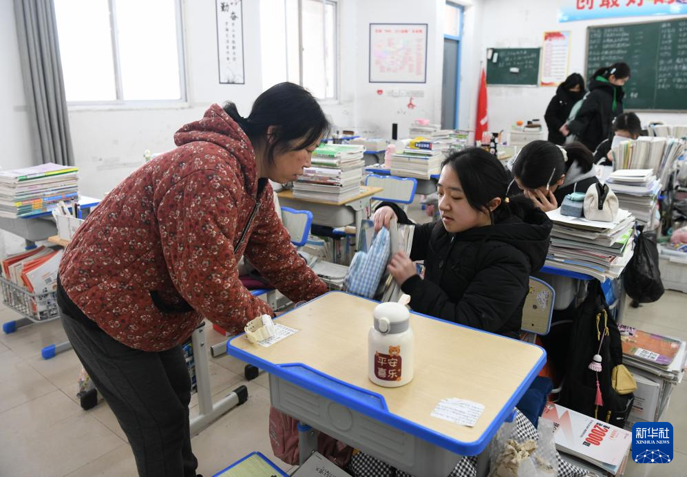 在宿城一中宿马学校,妈妈许成香送王子文到教室上课(2024年12月12日摄)。