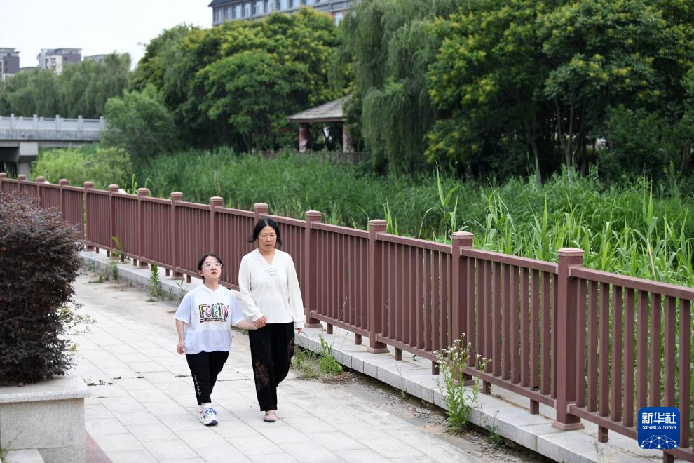 5月25日,在宿城一中宿马学校,王子文(左)和妈妈许成香散步。