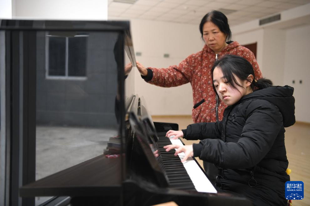 在宿城一中宿马学校的音乐室,王子文在妈妈许成香的陪伴下弹钢琴(2024年12月12日摄)。