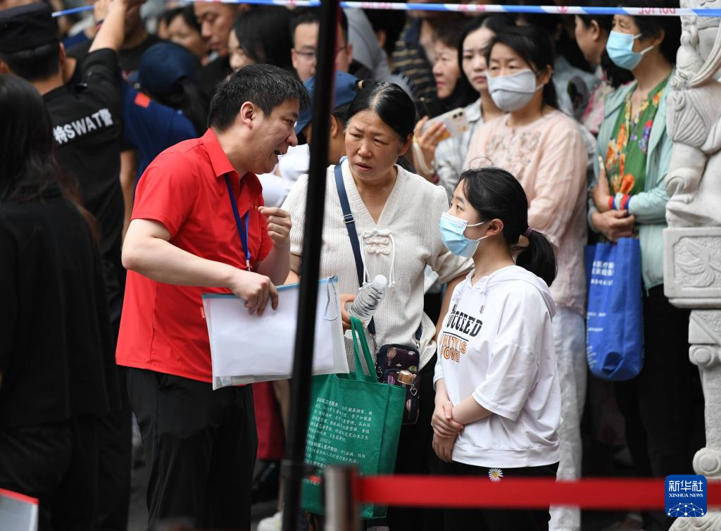 6月7日,在宿州市的一处高考考点外,王子文和班主任王龙(左)交流。
