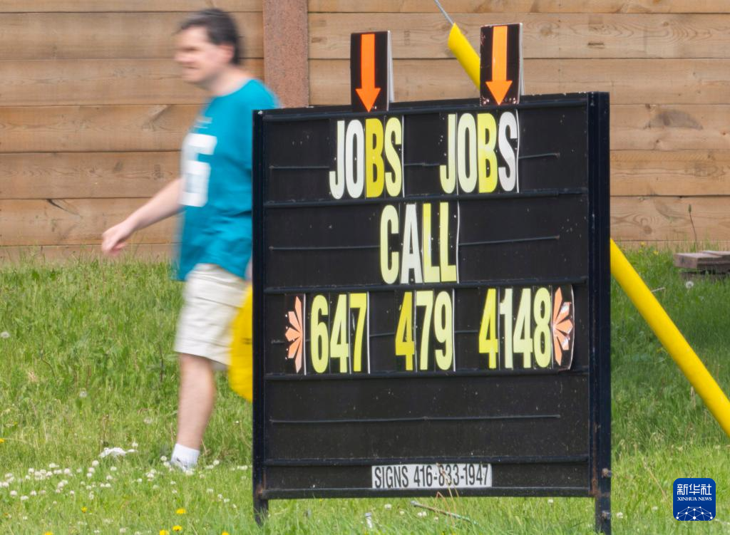6月6日,在加拿大多伦多,行人从一处快餐店外的招聘广告前经过。
