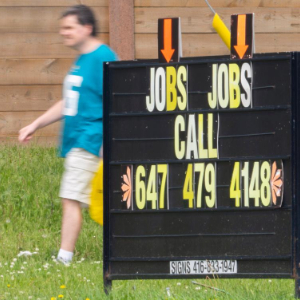 6月6日,在加拿大多伦多,行人从街头一处招聘广告牌前经过。