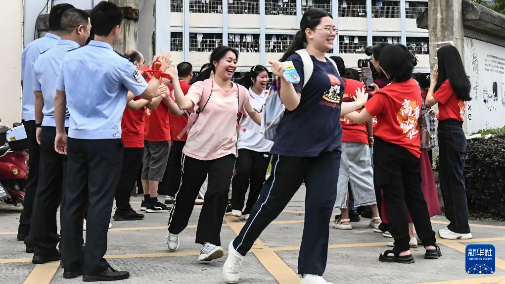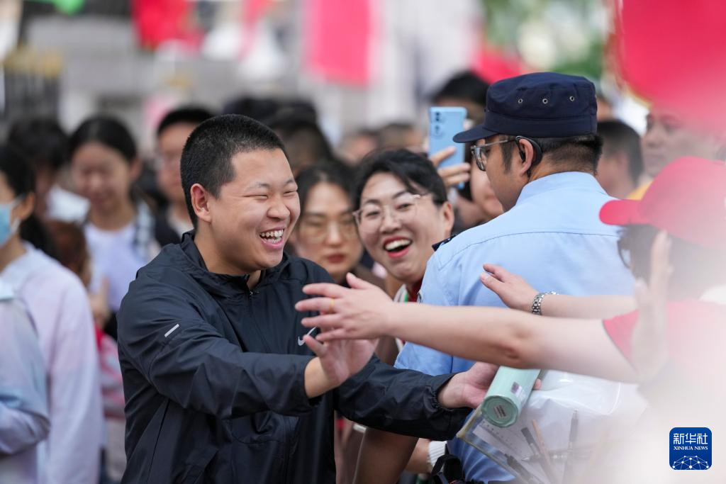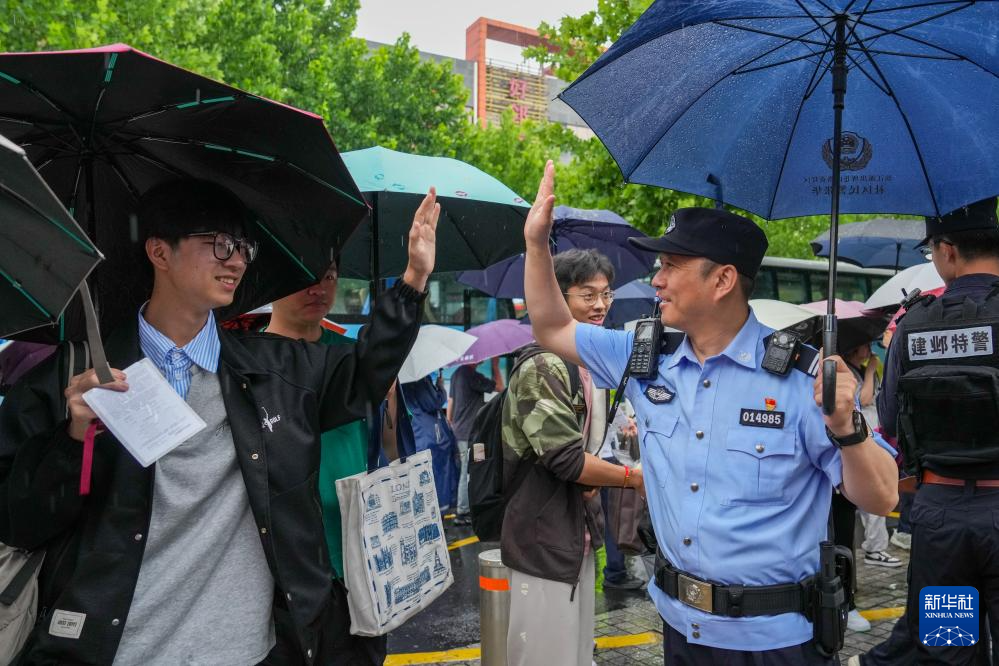 6月7日,在南京市建邺区中华中学考点外,南京市公安局建邺分局的民警与准备进入考场的考生击掌加油。