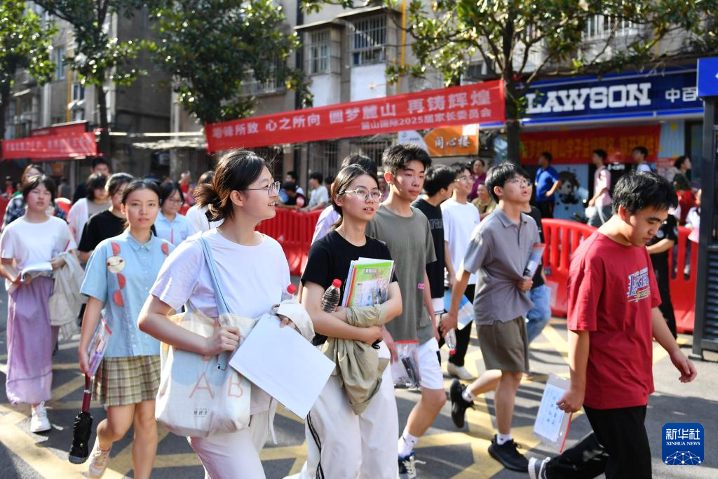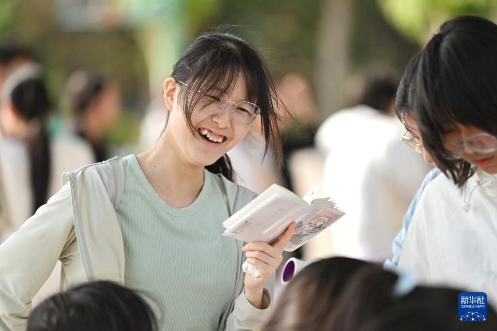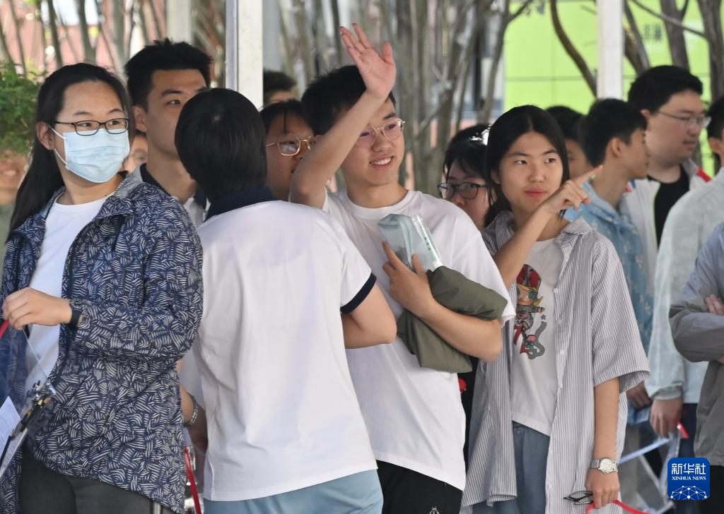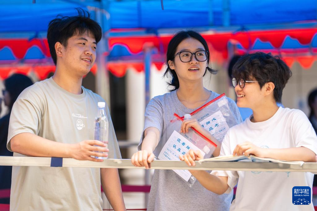 6月7日,在湖南省长沙市望城区长郡斑马湖中学考点外,考生们在交流。