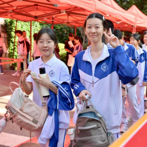 6月7日,在北京师范大学附属实验中学,一名考生走向考场时向门口等待的家长挥手。