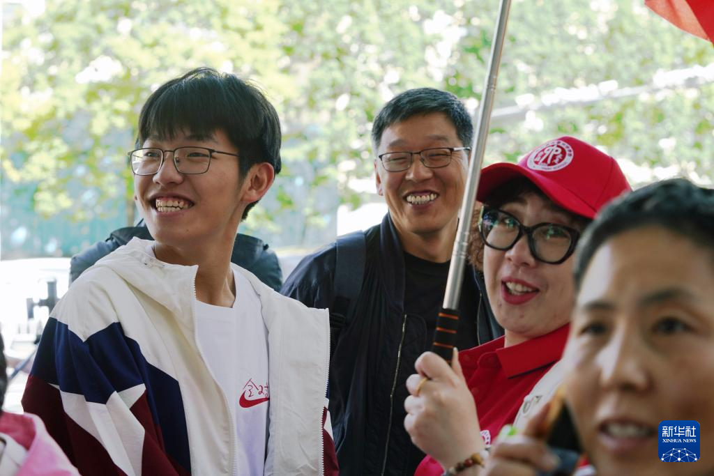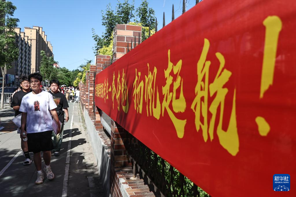 6月7日,在黑龙江哈尔滨市第九中学外,家长送考生(左)进入考点。