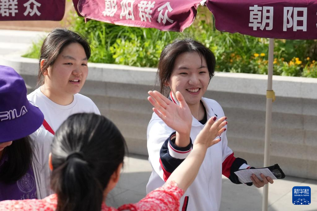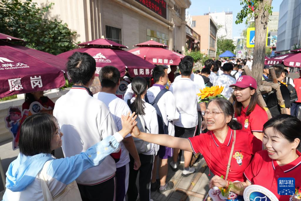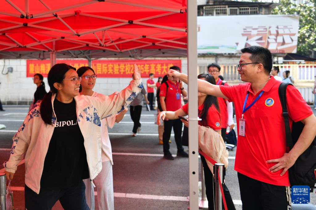 6月7日,在哈尔滨市第九中学考点,考生走入考场前与老师击掌加油。