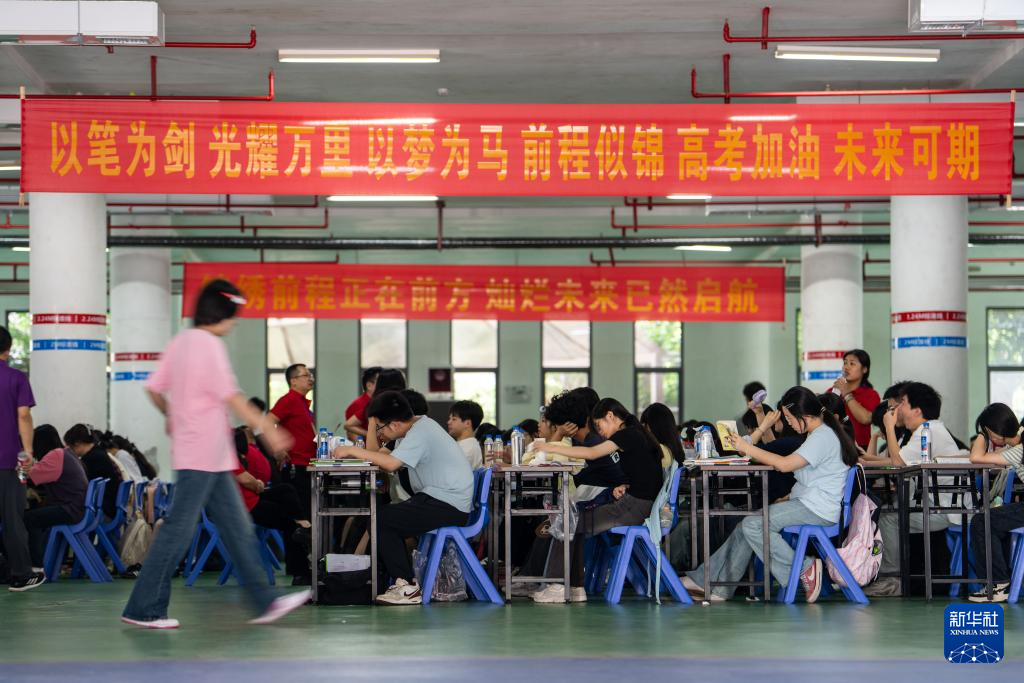 6月7日,考生在湖南省长沙市望城区长郡斑马湖中学考点休息区备考。