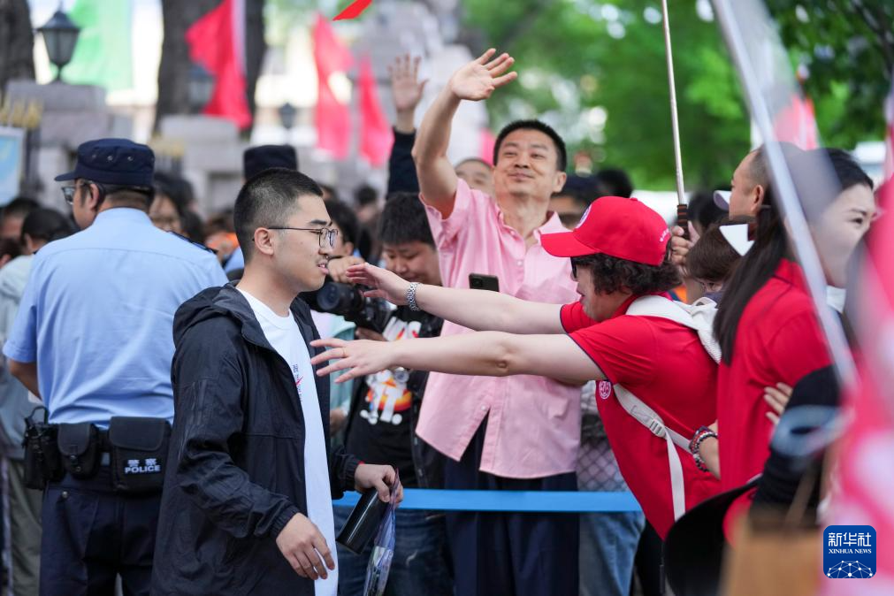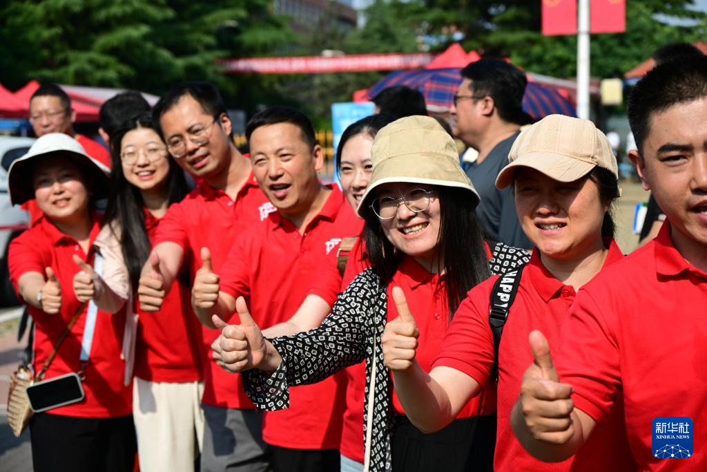 6月7日,在湖南省长沙麓山国际实验学校考点外,送考老师给考生加油鼓劲。